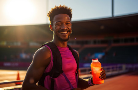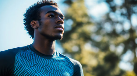 An evocative image suited for use in sports apparel campaigns, motivational fitness content, or articles discussing athlete mindsets | This photograph portrays a young male athlete in a moment of focus and determination before a competition or workout. He is pictured in a close-up, occupying a large portion of the frame, with a warm, blurry background, imparting a sense of immediacy and intimacy with the subject. The athlete's crisp, clear eyes gaze directly ahead, perhaps visualizing the race to come, while his athletic attract hugs his form, emphasizing his physical readiness and vitality. The soft, golden hour light illuminates his profile, highlighting his features and casting an almost halo-like glow around him, which not only accents the contours of his face but also suggests an aura of inspiration and perseverance. The blurred lanes of the track in the background evoke the setting of disciplined training and the pursuit of excellence inherent to track and field athletes | Perfect for incorporation into fitness inspiration blogs, advertising health and wellness products, or as visual material for coach's training manuals. The photograph also has potential as a powerful illustrative element in storytelling to convey themes of ambition, preparation, and mental strength. Additionally, it could grace the walls of sports facilities or personal gyms as a symbol of the dedication required to excel in athletics | a compelling portrait of a focused track athlete, set against a softened backdrop of a running track, bathed in the natural light of sunset, which underscores the themes of anticipation, training, and the athlete's mental game, with ample negative space suitable for text overlays or additional design elements