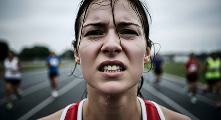 An extreme close-up captures the gritty determination on the face of a sweaty, exhausted female athlete during a track race. Her grimace and clenched teeth convey the immense physical and mental effort of endurance sports, with other competitors blurred behind her.