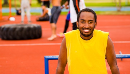 Man wearing yellow shirt and blue shorts smiling while posing for camera at outdoors training facility with orange athletic surface, blurry people background.