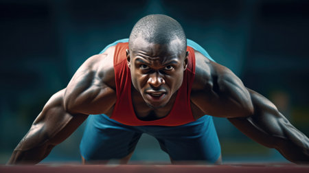 A powerful black athlete on the running race track, showcasing strength, speed and fitness