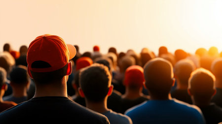 A Crowd of people facing sunset, with focus on man in red cap. scene captures moment of unity and anticipation