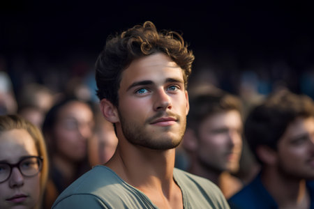 Portrait of a handsome young man looking at the camera in front of a crowd