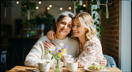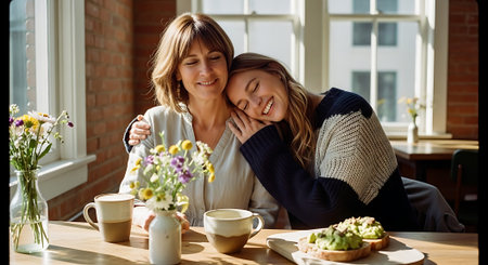 A mother and daughter sharing a tender moment at a cozy dining table with tea cups, flowers, and pastries.