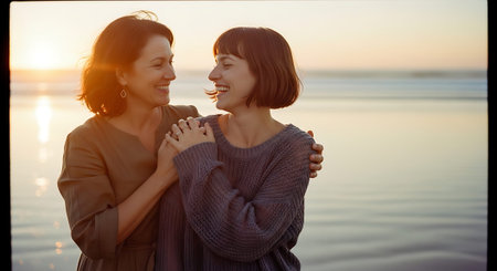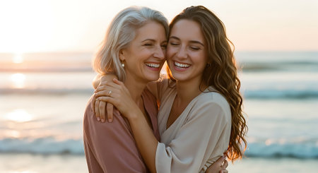 A mother and daughter share a joyful embrace at sunset by the ocean. The warm, golden light illuminates their faces as they stand close together, smiling.