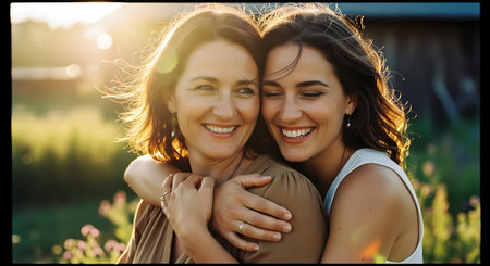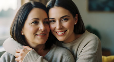 A tender moment between a mother and her adult daughter as they embrace with closed eyes in a cozy living room. The image conveys deep love, support, and the strong bond between family members.