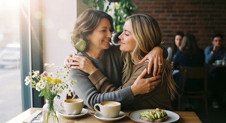Two women embracing and smiling at a cozy cafe table with flowers, cups of coffee, and plates of food.