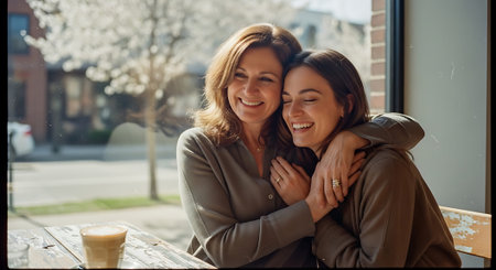 Portrait of beautiful mature woman and her adult daughter in cafe.