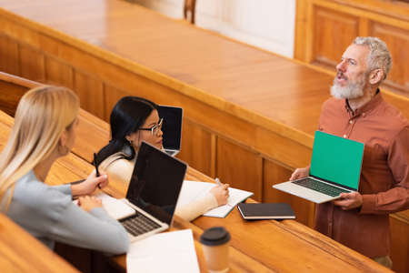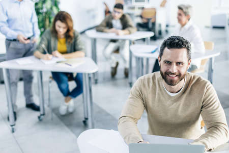 Adult learning. Portrait of mature teacher or tutor professor working at table in college or high school.