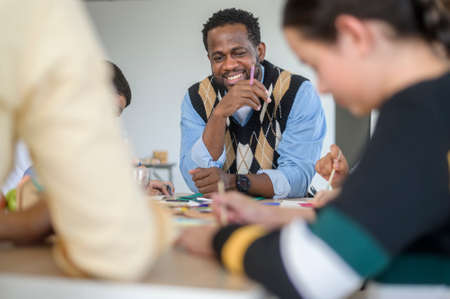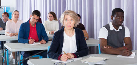Multiethnic students and teacher study foreign languages together in class. Studing with notebook. Black attractive girl student study with white people together and look into camera