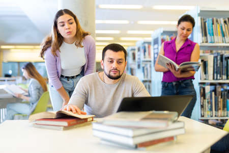 Young Middle Eastern man and Black woman helping mature man to find something in Internet in university library