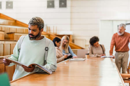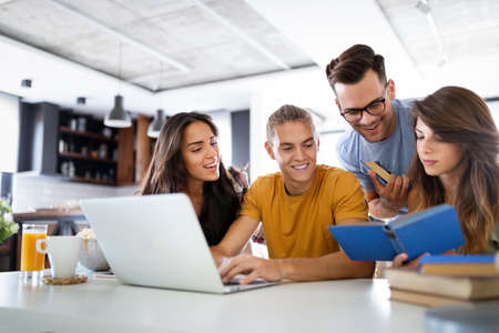 High school or college student group catching up workbook and learning tutoring in classroom and reading, doing homework and lesson practice preparing exam.
