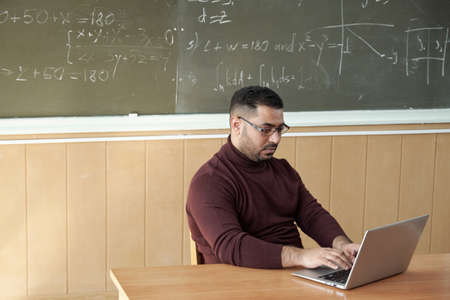 Knowledge day. Man work school teacher sit in classroom. Handsome hipster mature smart educator. Use laptop and internet. Officially submitted application online. School homework. Back to school