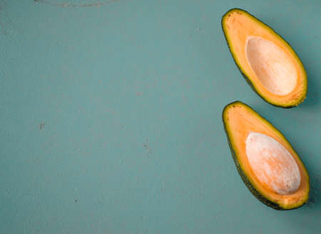 Flat lay top view Avocado isolated on a mint pastel background with a shadow. Horizontal orientation