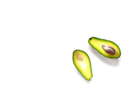 Avocado with seed isolated on white background. Source of omega 3 from natural food. Healthy food for baby. Half pieces of avocados arranged with beautiful pattern. Organic food for vegetarian.