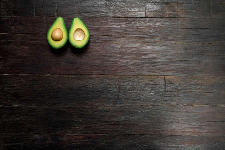 Organic food concept with ripe avocado on dark wooden table with copyspace