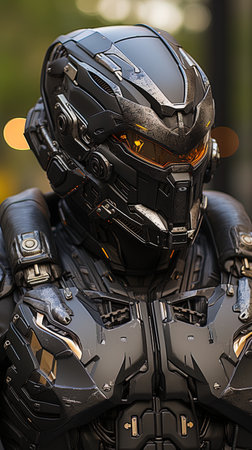 A striking armored figure with a sleek design poses in a historic location as evening approaches.