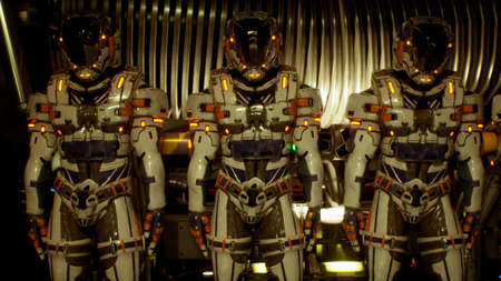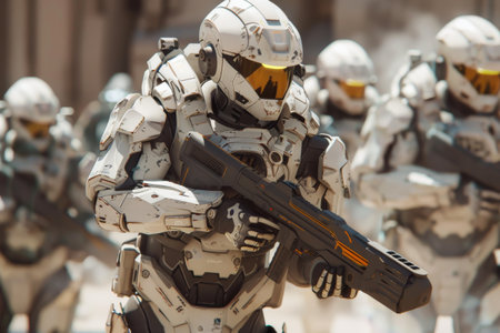 A group of advanced robotic soldiers stands in formation, equipped with sophisticated firearms and armor.