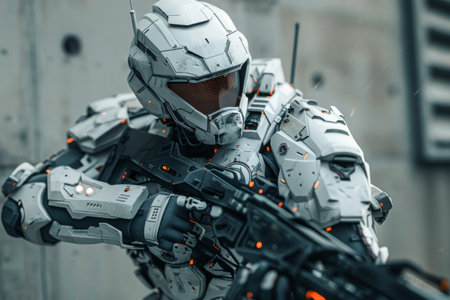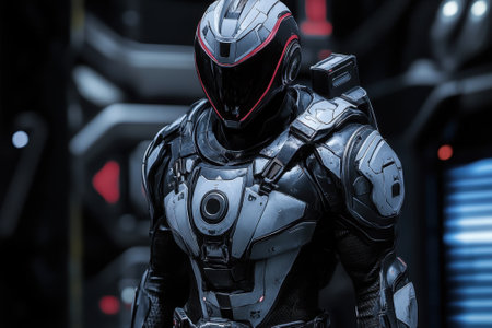 The armored soldier in advanced gear appears prepared for action in a sleek, futuristic environment.