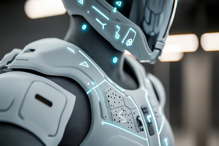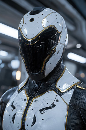 A detailed combat suit with glowing accents is displayed in a sleek, modern setting, emphasizing advanced design.