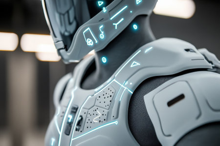 A high-tech robotic suit stands prominently, showcasing its glowing circuitry in a futuristic ambient light.