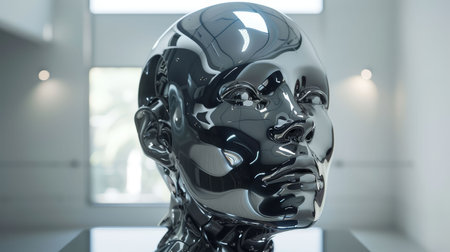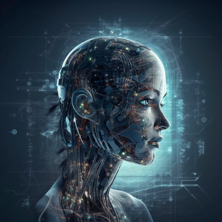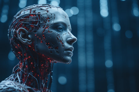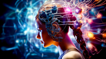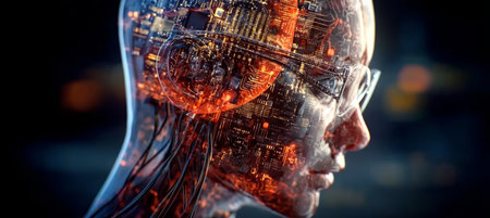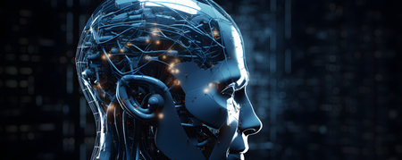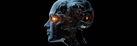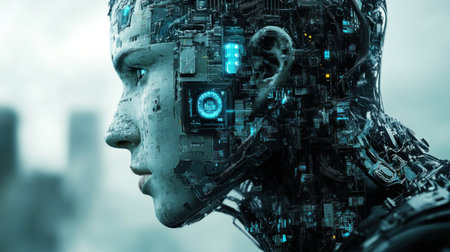 A stunningly portrayal merges a human head with an AI machine, showing intricate cybernetic details.