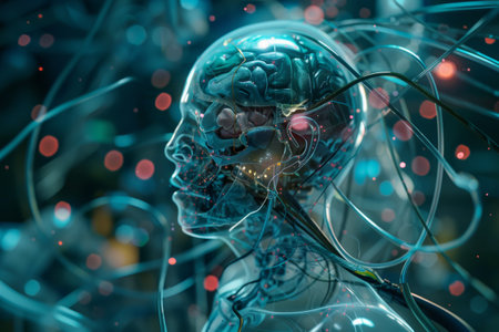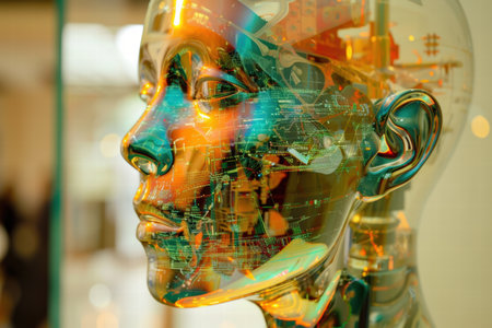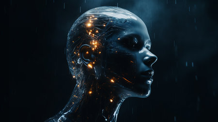 A clear, artificial head displays intricate circuits and glowing components inside. The detailed design highlights technology and innovation in a futuristic style.