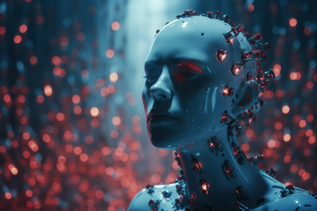This striking image depicts the merging of a human face and robot features, exploring themes of technology, connection, and the future of artificial intelligence.