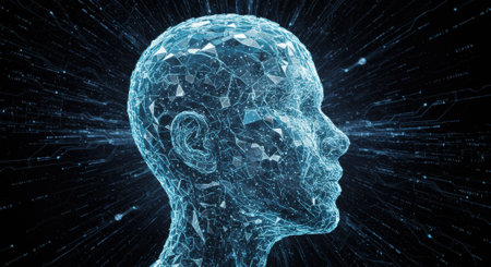 Digital human head composed of glowing polygonal fragments and data lines, representing artificial intelligence, technology, and interconnected networks on a dark background.