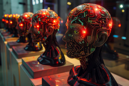 Electronic mannequin heads with illuminated circuit patterns on display, showing advanced technology design