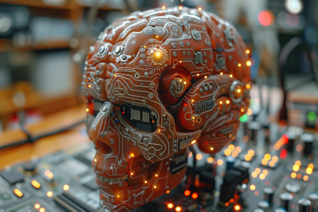 Intricate circuit design on a robotic skull with glowing elements
