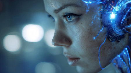 Close-up portrait of woman with blue eyes enhanced by futuristic digital interface and glowing technological elements overlay.