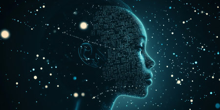 This striking image depicts a human-like profile made of abstract elements, exploring themes of technology and imagination in a futuristic context.