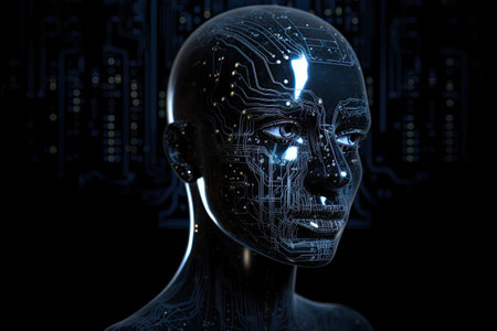 Electronic human head reveals inner circuit details on a dark background ideal for illustrating themes of artificial intelligence and technology.