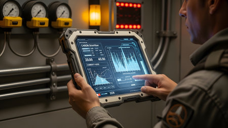An engineer interacts with digital graphs and data on a rugged tablet in a technical environment...