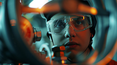 Female worker wearing protective glasses inspection at valve oil and gas plant