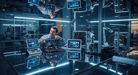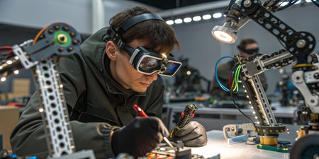 A focused engineer assembles electronic parts while wearing safety goggles in a well-equipped robotics laboratory. Numerous robotic arms surround him, showcasing technology.