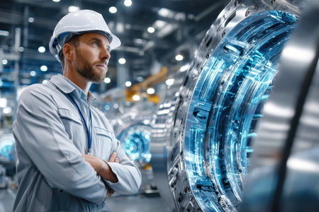 A man in a yellow helmet stands in front of a large turbine. Concept of awe and respect for the power of the machine, as well as the importance of safety precautions when working with such equipment