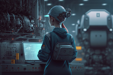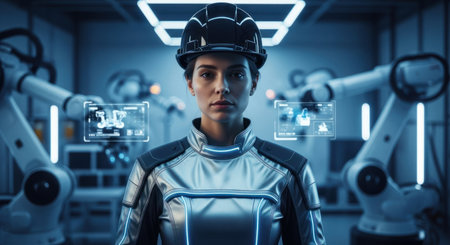 Female robotics engineer in a hard hat and futuristic suit stands in a high tech industrial facility. robotic arms and glowing holographic interfaces are visible, representing innovation and automation.