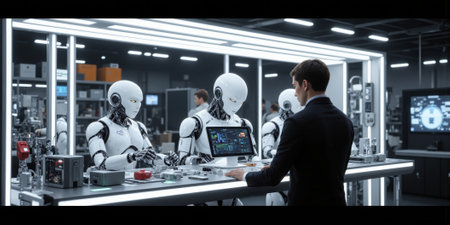 Robots Laboratory Future: Human Overseeing Advanced AI Robots Working