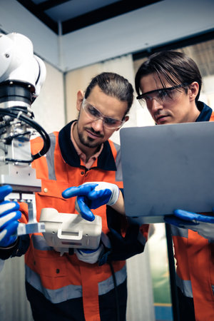 Multiracial tachnicial engineer training with robot arm machine in Robot machine factory workshop.