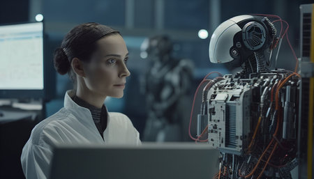 Close-up of robotic technician coding in advanced AI lab, detailed automation setup ideal for branding