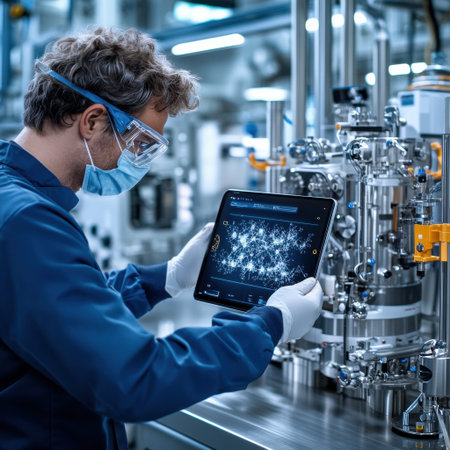 A man wearing a lab coat and goggles is looking at a tablet. He is wearing a mask and gloves. Concept of caution and precision in a laboratory setting