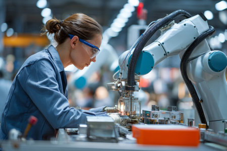 A focused technician in safety glasses works with an industrial robot in a busy manufacturing facility. The atmosphere is energetic and productive as machinery operates.