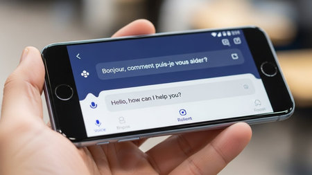 AI-Powered Language Translate App Concept. A person holds smartphone displaying an AI powered language translation app. Screen features robot and multiple languages, symbolizing global communication.