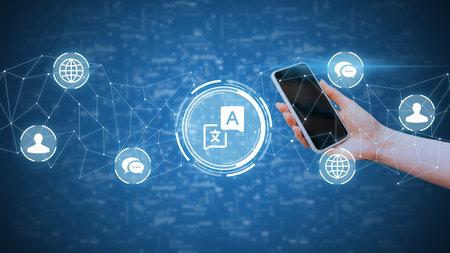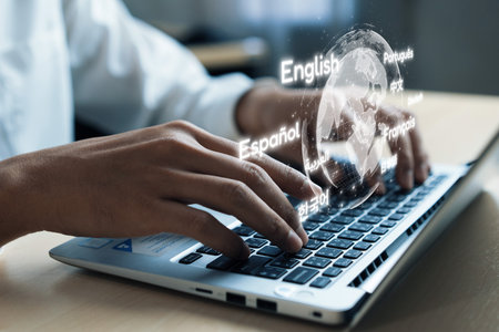 Global communication with multiple languages, digital translation tools, multilingual technology, cross-cultural communication, and virtual language learning environments.