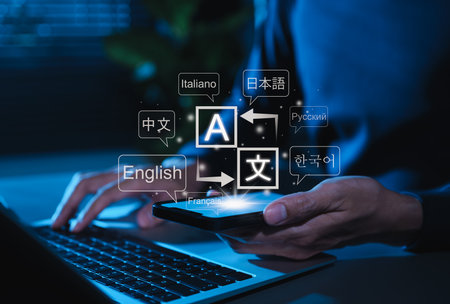 Multilingual Language Translation, Communication Concept. Man using phone with icons various languages, global language translate, multilingual technology, international connections, AI translator,