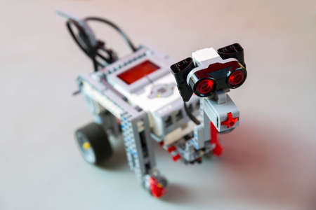 Toy robot made from toy plastic colorful blocks. Dog toy.