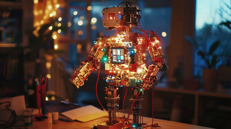 A captivating robotic figure adorned with bright lights stands in a cozy workspace, showcasing intricate design and creativity, blending technology with warm ambiance.