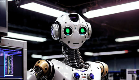 Modern humanoid robot standing amidst advanced scientific equipment in a futuristic laboratory setting