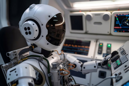 Humanoid robot with a reflective visor sits at the controls of an advanced spacecraft cockpit